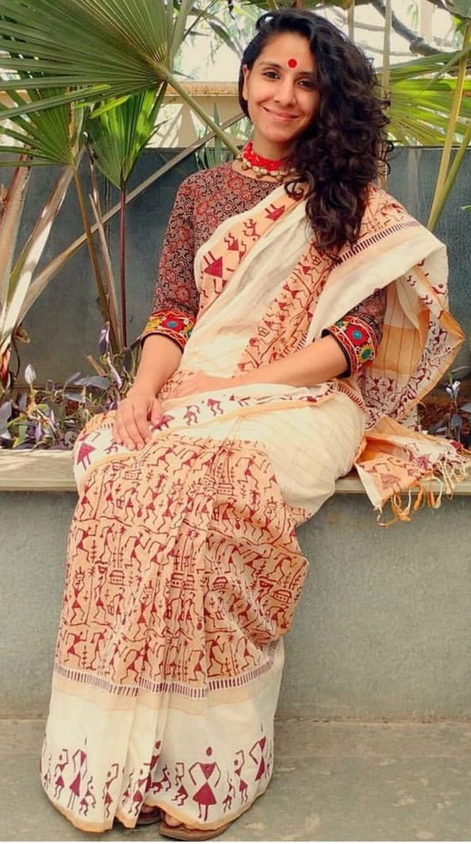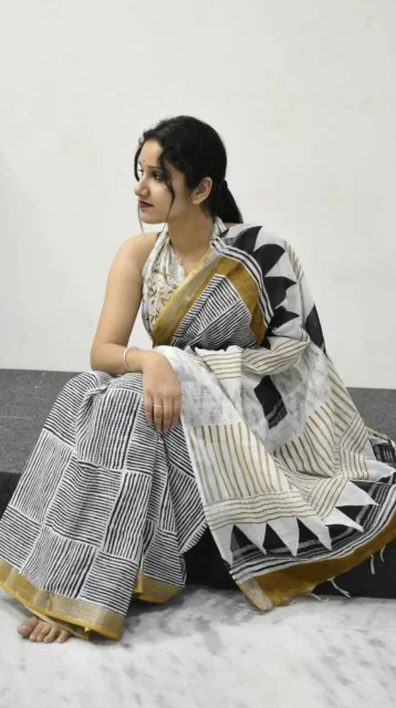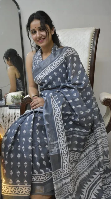 Women Hand block printed linen Saree With Blouse Saree