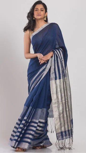 Navy Blue Linen Saree With Silver Handloom Saree
