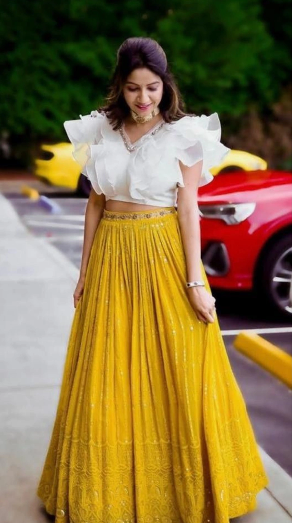 Elevate your fusion style with this chic and vibrant ensemble from Deepvastar. The set features a soft white crop top adorned with layered chiffon ruffles and a flowy long shrug, paired with a stunning mustard yellow organza skirt embellished with subtle sequin and thread detailing. This breezy and modern look is perfect for festive brunches, haldi functions, or intimate celebrations.