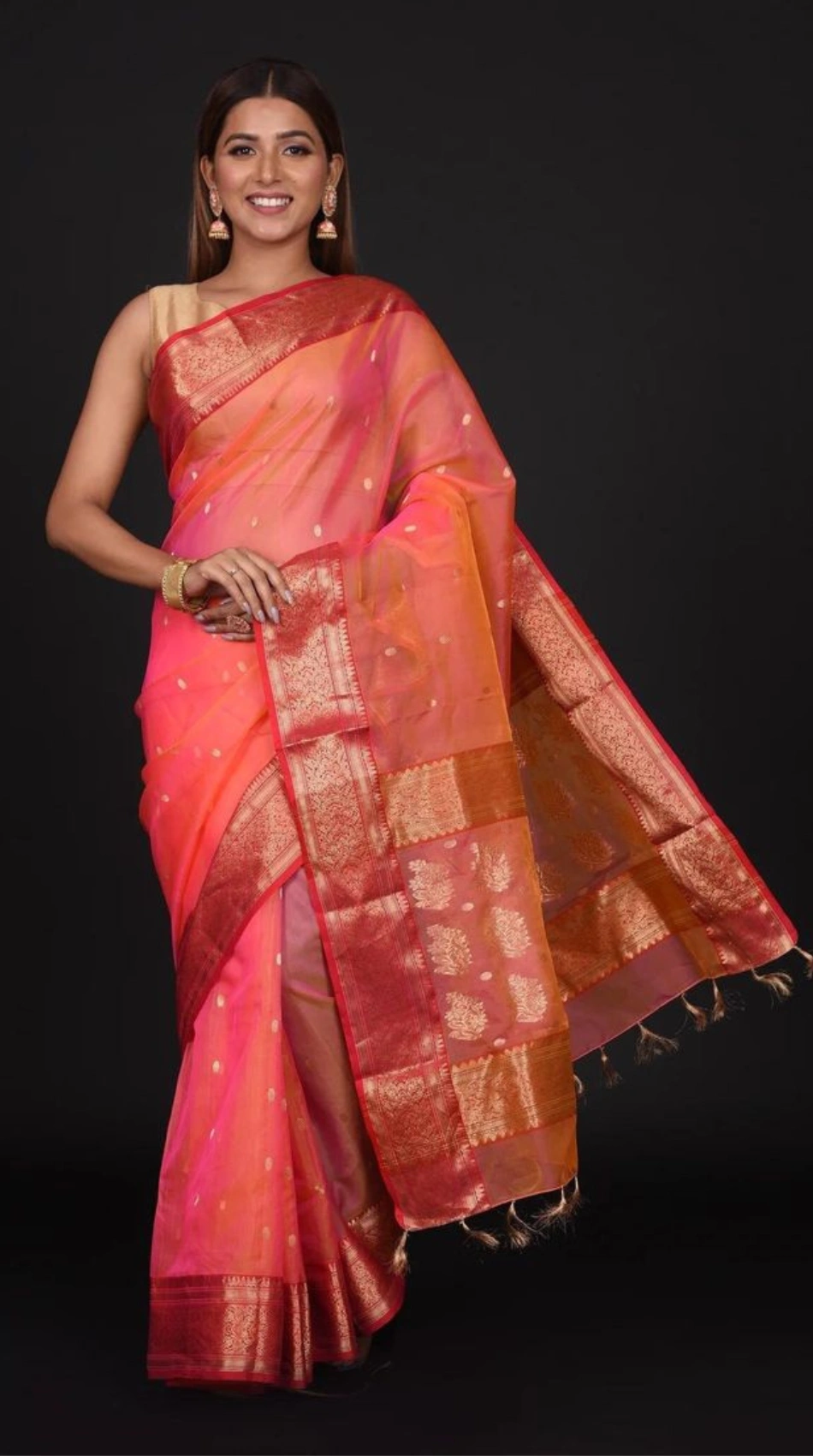 Design: Delicate golden zari butis across the body with a rich, contrasting zari border and pallu