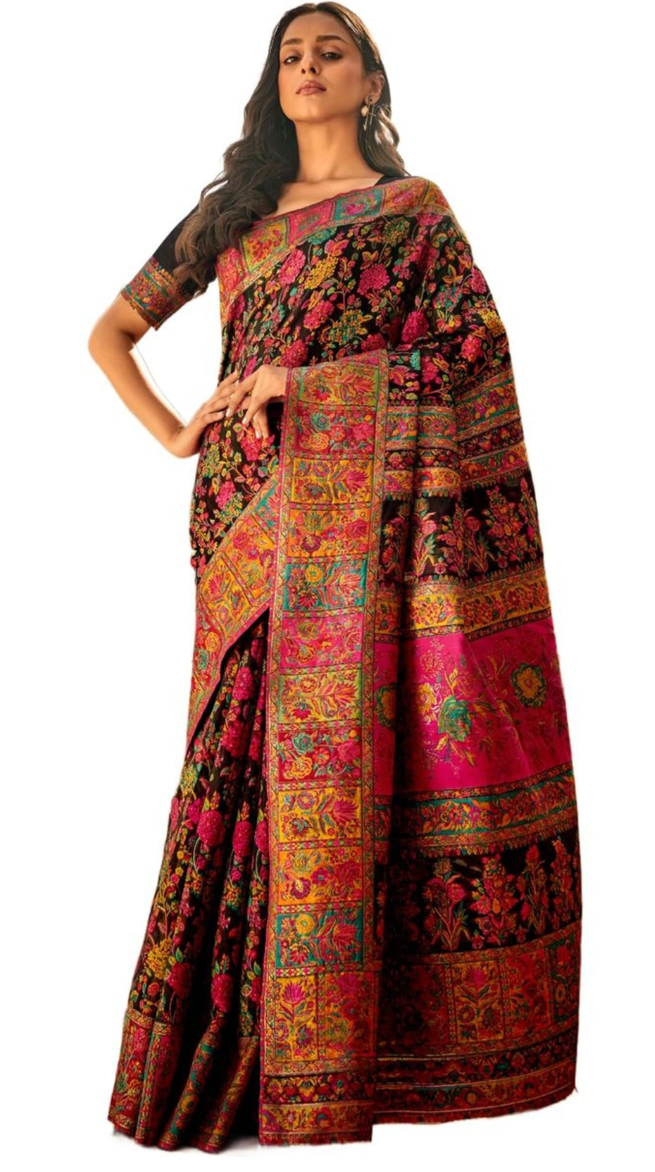 The standout skirt-style border features richly painted floral and mythological motifs in multicolor hues, set against a deep black base with hints of magenta and gold, creating a regal and festive aura. Lightweight yet grand, this saree is perfect for weddings, cultural festivities, and statement-making appearances.