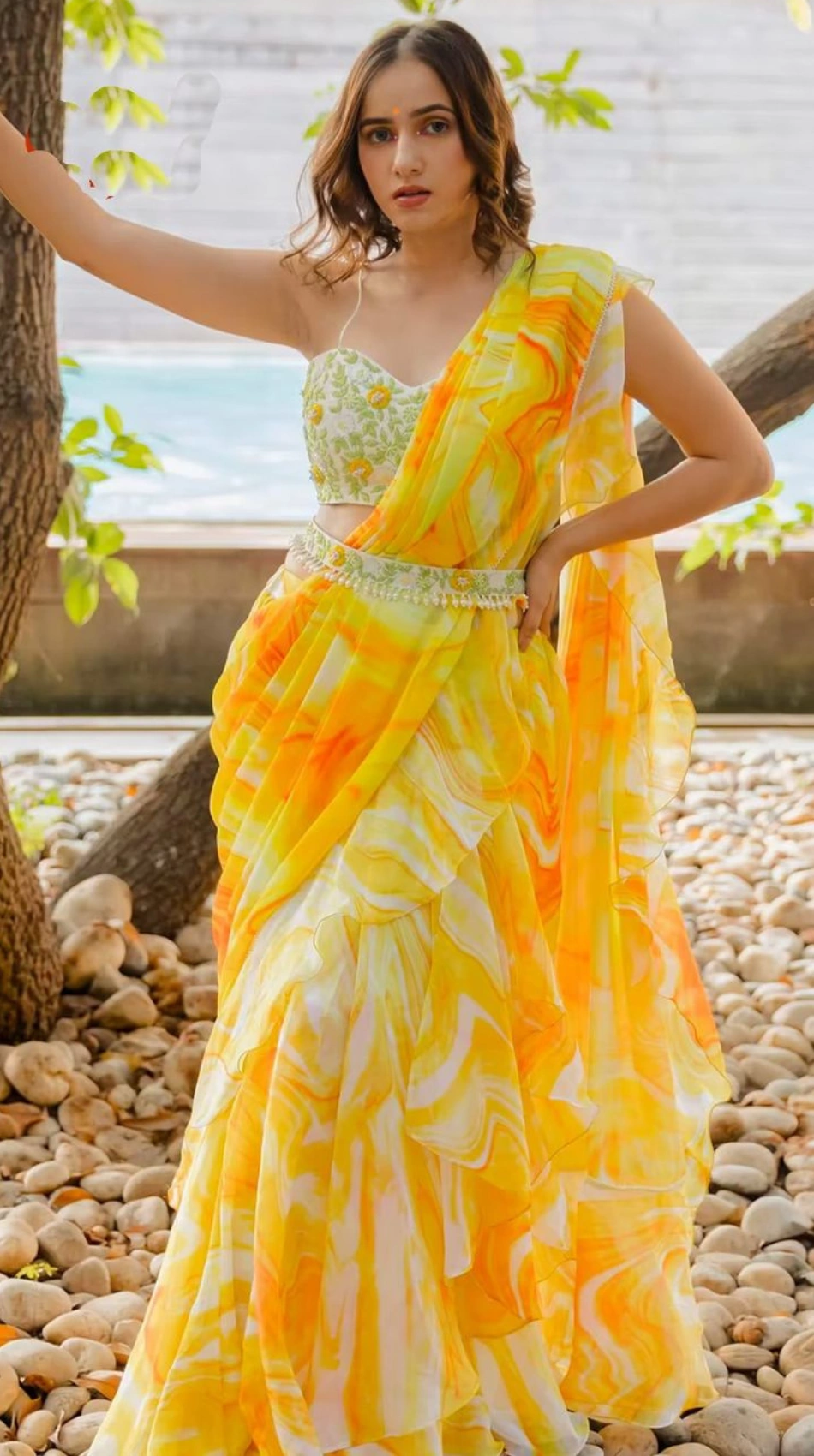 Paired with a delicately embroidered floral blouse in green and white tones, the look is effortlessly chic and comfortable. Accented with a charming waist belt and cascading ruffles, this outfit is a dream pick for bridesmaids or the bride herself during the Haldi function.