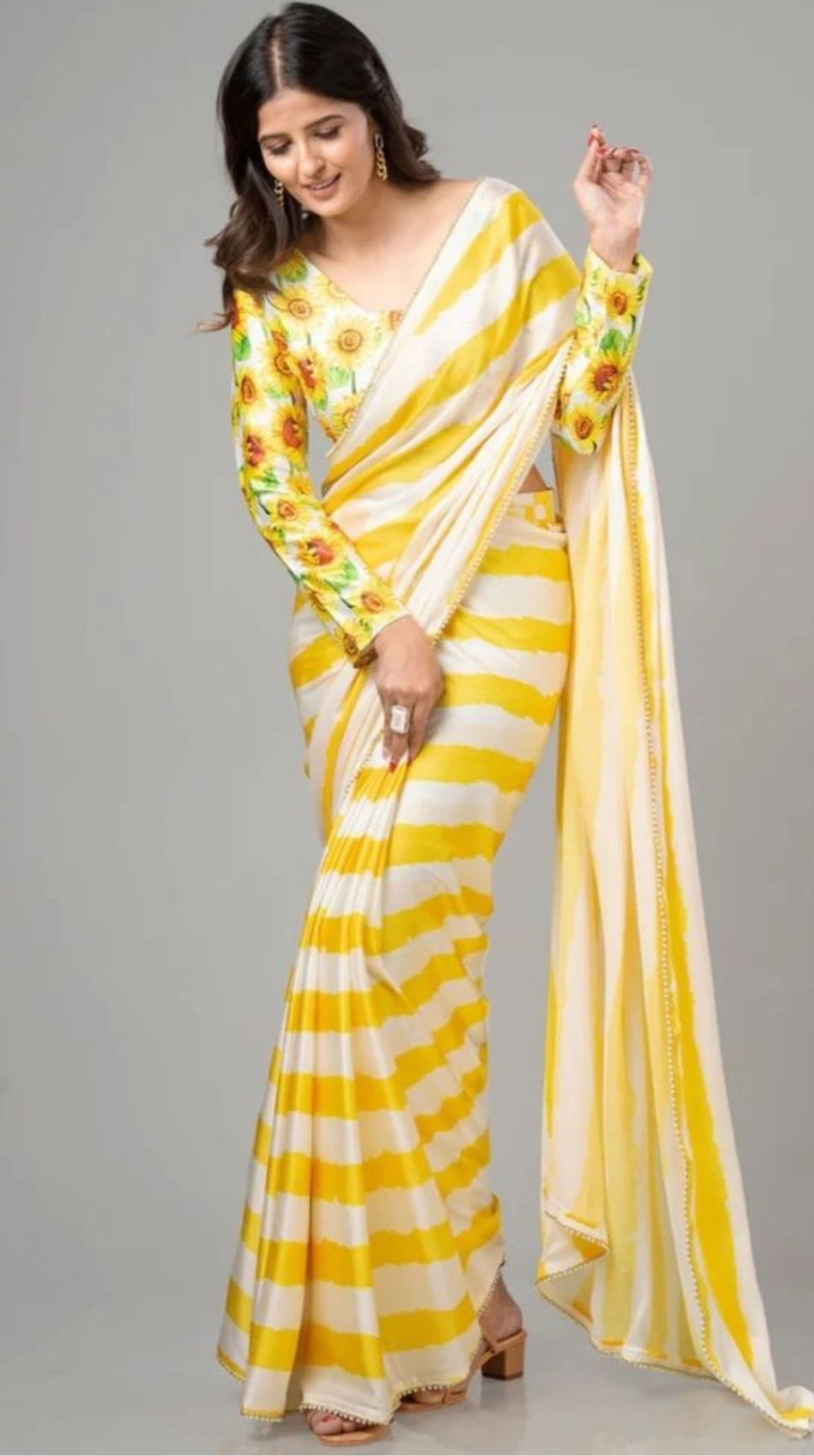 Turn heads with this vibrant yellow and white striped saree – a fresh, modern twist on a traditional classic! Crafted from soft, breathable fabric, it features bold stripes paired with a floral blouse for a statement Haldi or festive look.